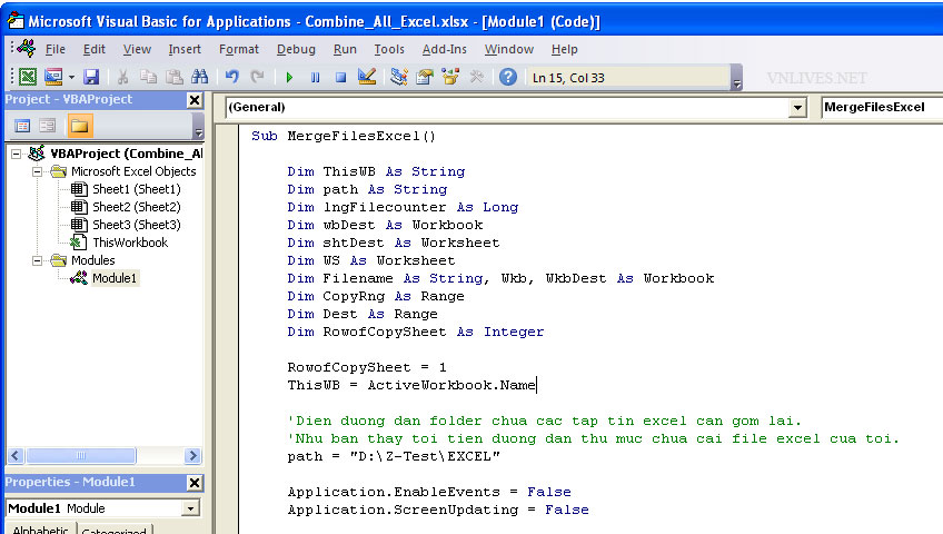 Tiếp theo bạn copy đoạn mã code bên dưới vào bản soạn thảo Module1 (Code). Đoạn macro này sẽ thực hiện việc copy tất cả dữ liệu ở tất cả các tập tin excel vào Sheet 1 của tập tin excel "Combine_All_Excel.xlsx", bạn lưu ý thay đổi đường dẫn path = "D:\Z-Test\EXCEL" cho tương ứng với thư mục chứa các tập tin excel cần gom.